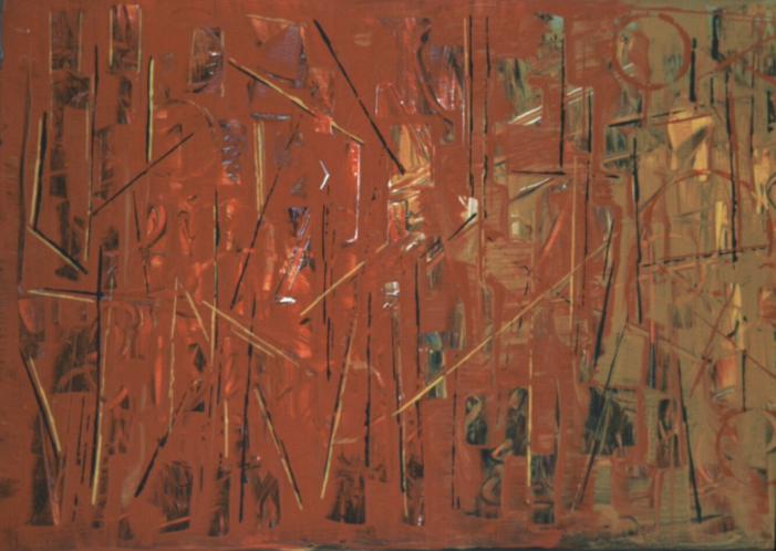 Als Hintergrund diente eine paradiesische Traumlandschaft. Sie ist nicht mehr als solche zu erkennen, trieft vor Blutrot und Neidgelb, verblaßt in sich selbst vor diesem ihr so brutal auferlegten Szenario.