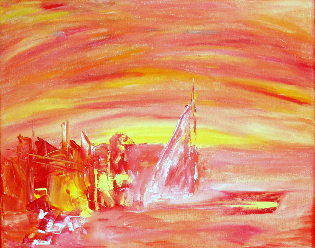 Eine frühere Variante zu diesem Thema bot irgendwelchen nicht auszumachenden Figuren zwar ein Segelboot zur Reise an, doch ein eventuelles Ziel war bildhaft nicht auszumachen; womöglich lag es jenseits der Darstellung.