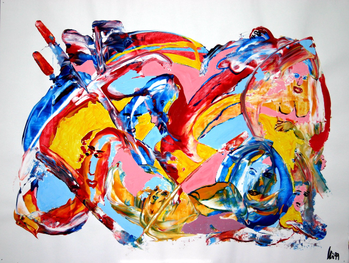 Wer es noch genauer wissen will, mag in der linken Hälfte einen Torso erkennen, eine gelbe Corsage, angedeutete, wogende Brüste, also eine Frau. Der rechte Arm, also links zu sehen, ist entweder auf dem Rücken verschränkt oder er geht zum Busen. Über allem offenbar eine breite Schulter, eine Art Cape. Kein Kopf, sondern ein paar heraus ragende Elemente, fast wie die Clubs aus einem Golfbag oder zwei sich entfernende Reiter mit Turban und Lanzen? Zu reißerisch?